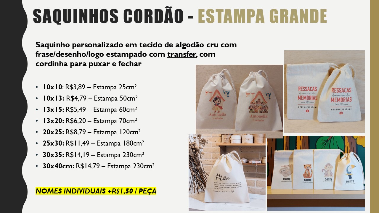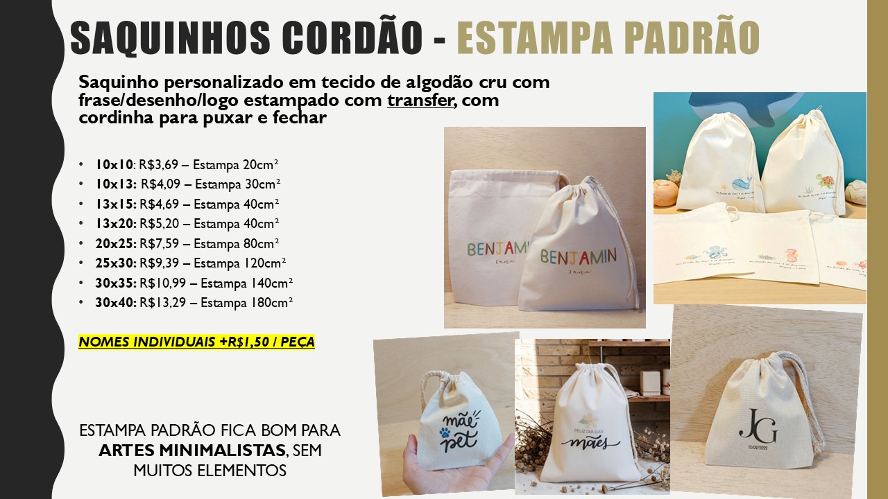 Saquinho Moda - Logotipo - Lembrancinha - Estampa Personalizada - Algodão Cru com Cordão Embutido - 10x13cm