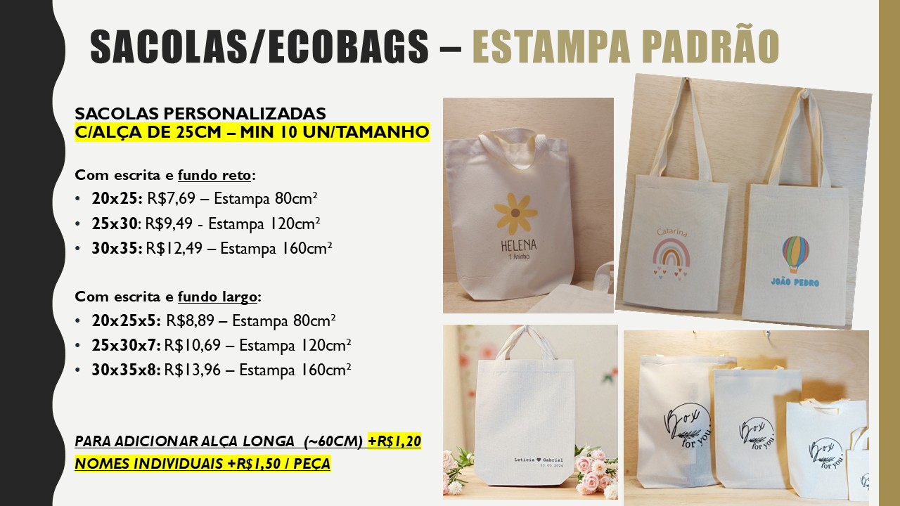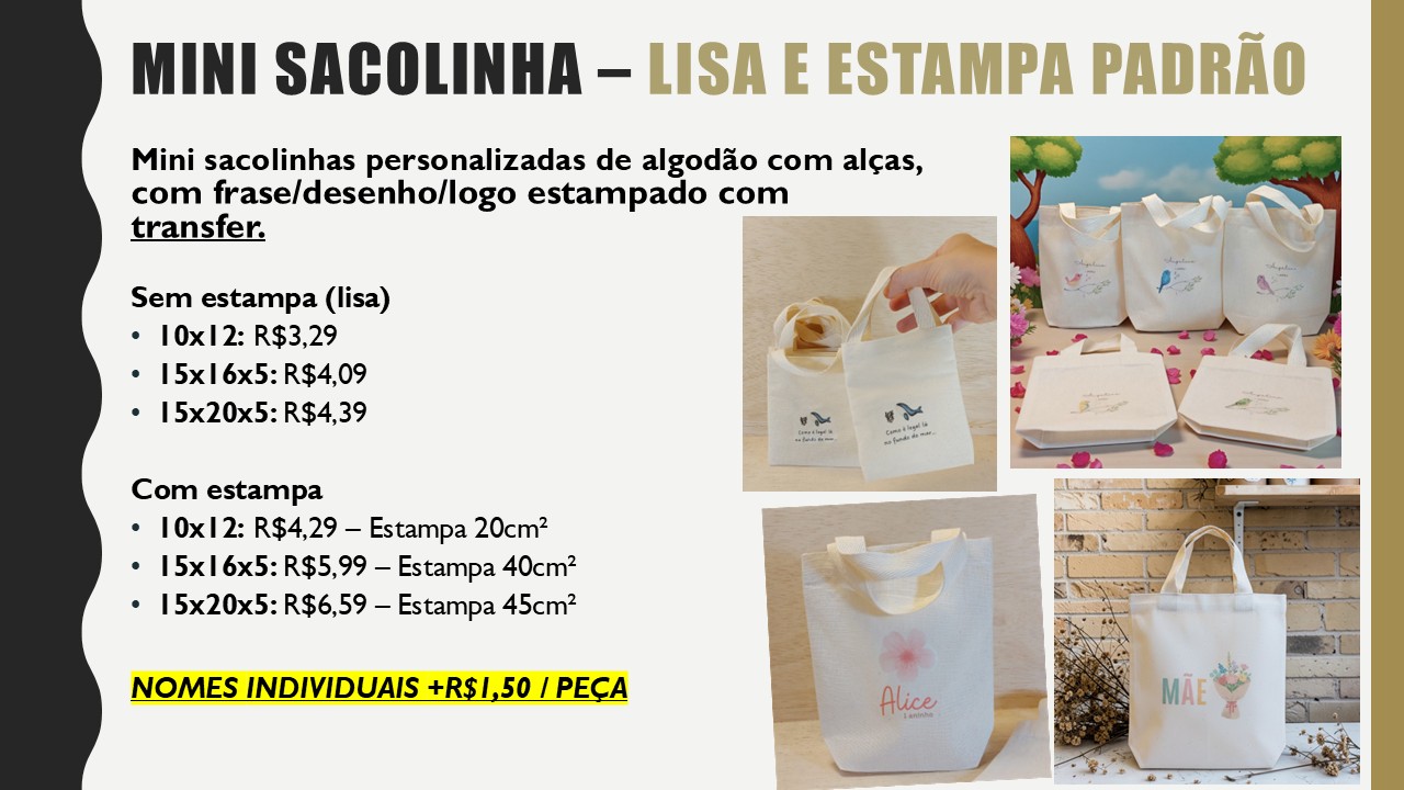 Kit Desconto Sacolinha Minibag com Saquinho - Sua Marca - Personalizada - Estampa Padrão - Algodão Cru - Brinde Personalizado