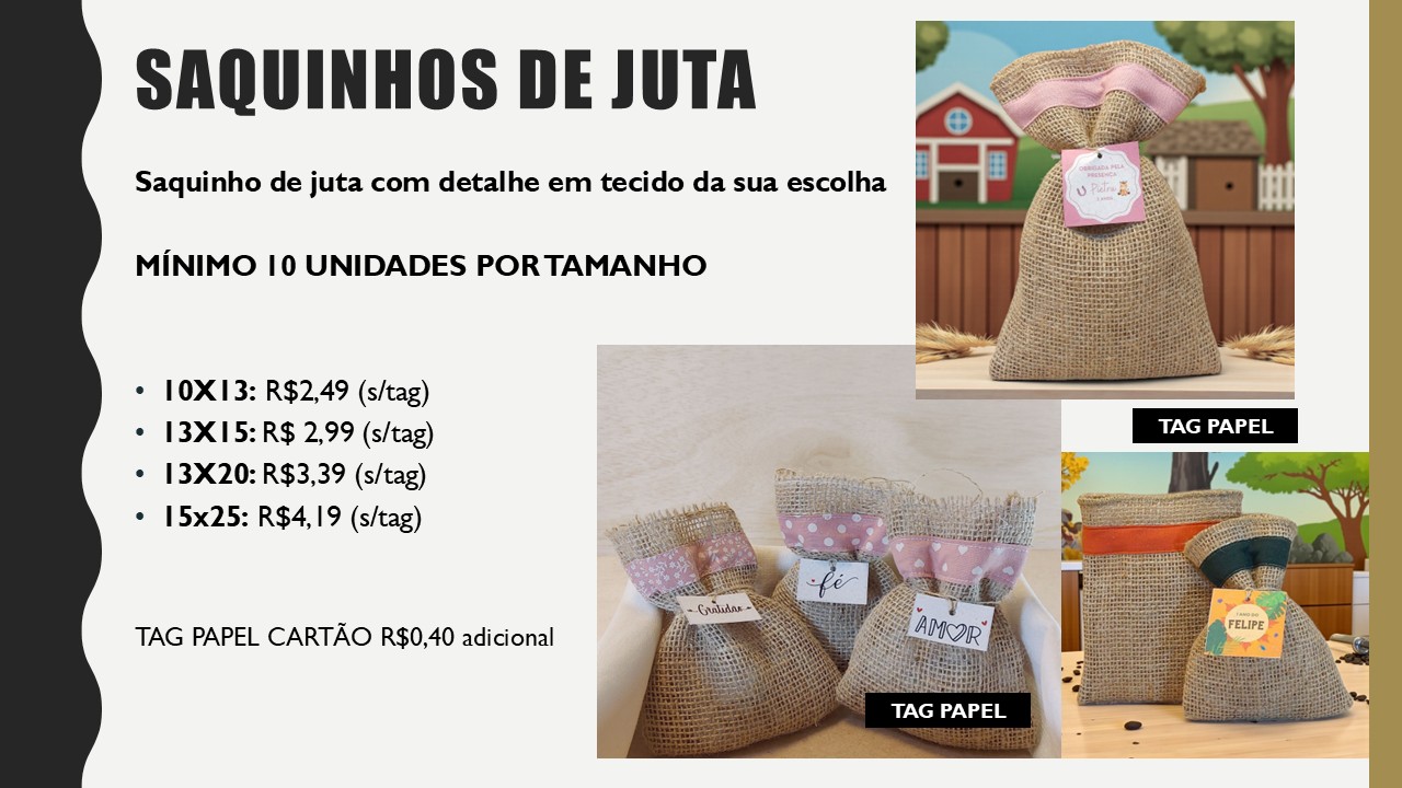 Saquinho de Juta Mercearia - Logotipo - Detalhe em Tecido - Tag Personalizada - Lembrancinha