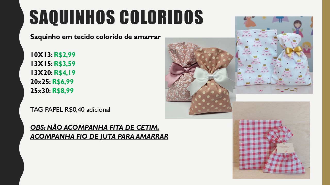 Saquinho de Juta Colorido - Detalhe em Tecido - Tag Personalizada - Lembrancinha